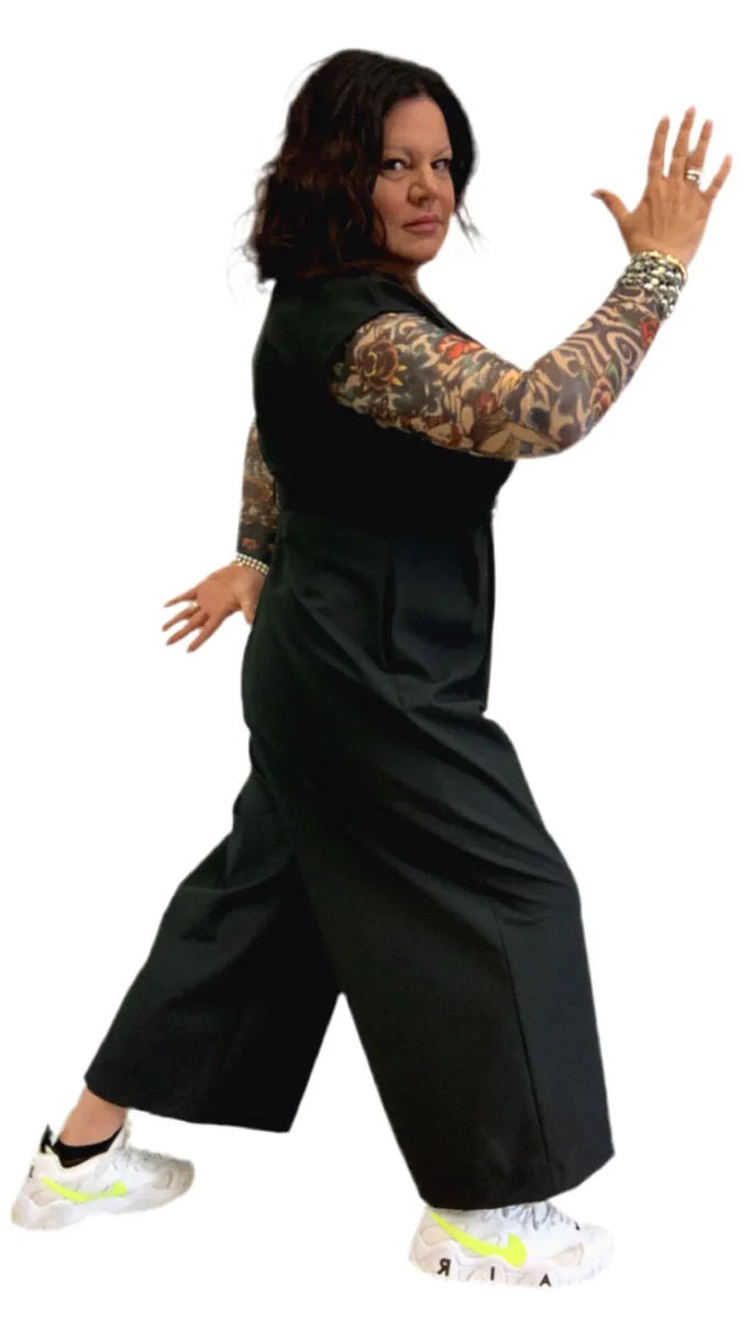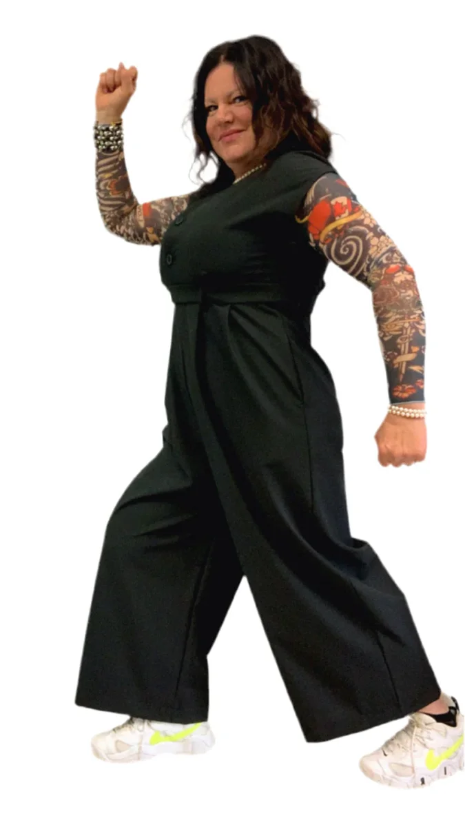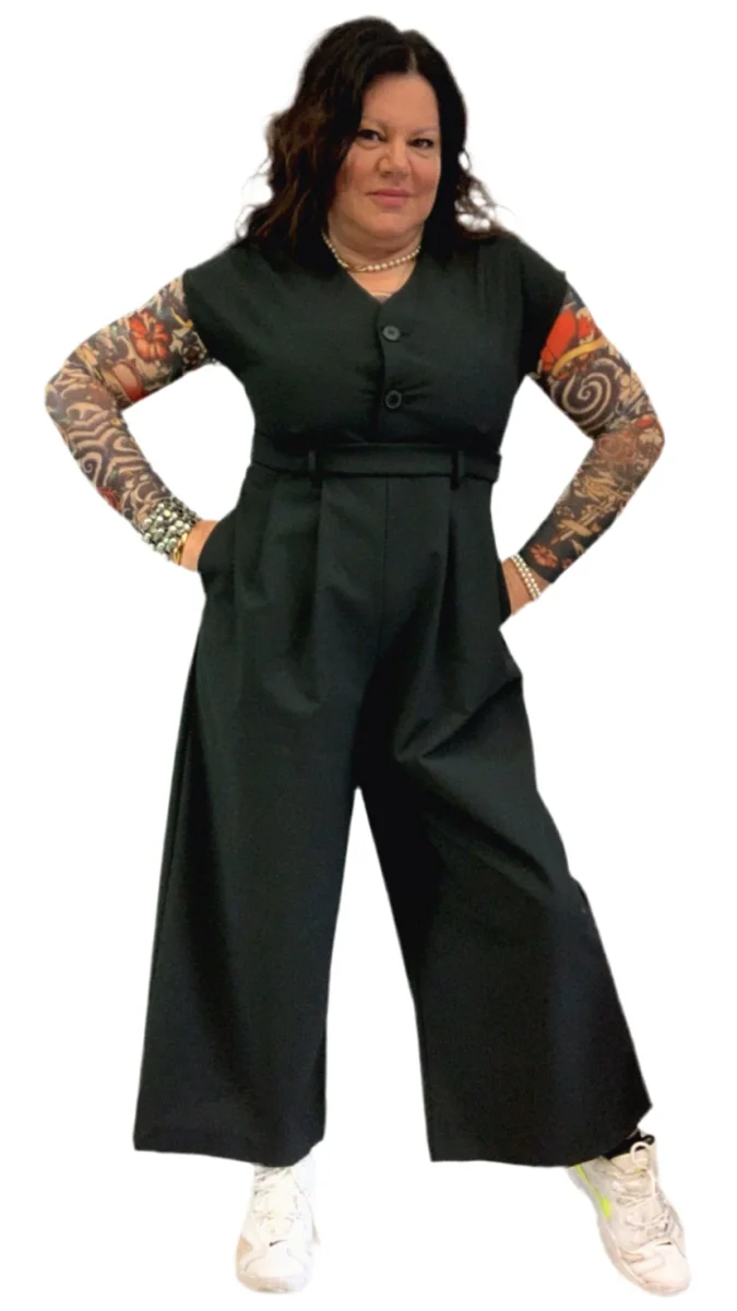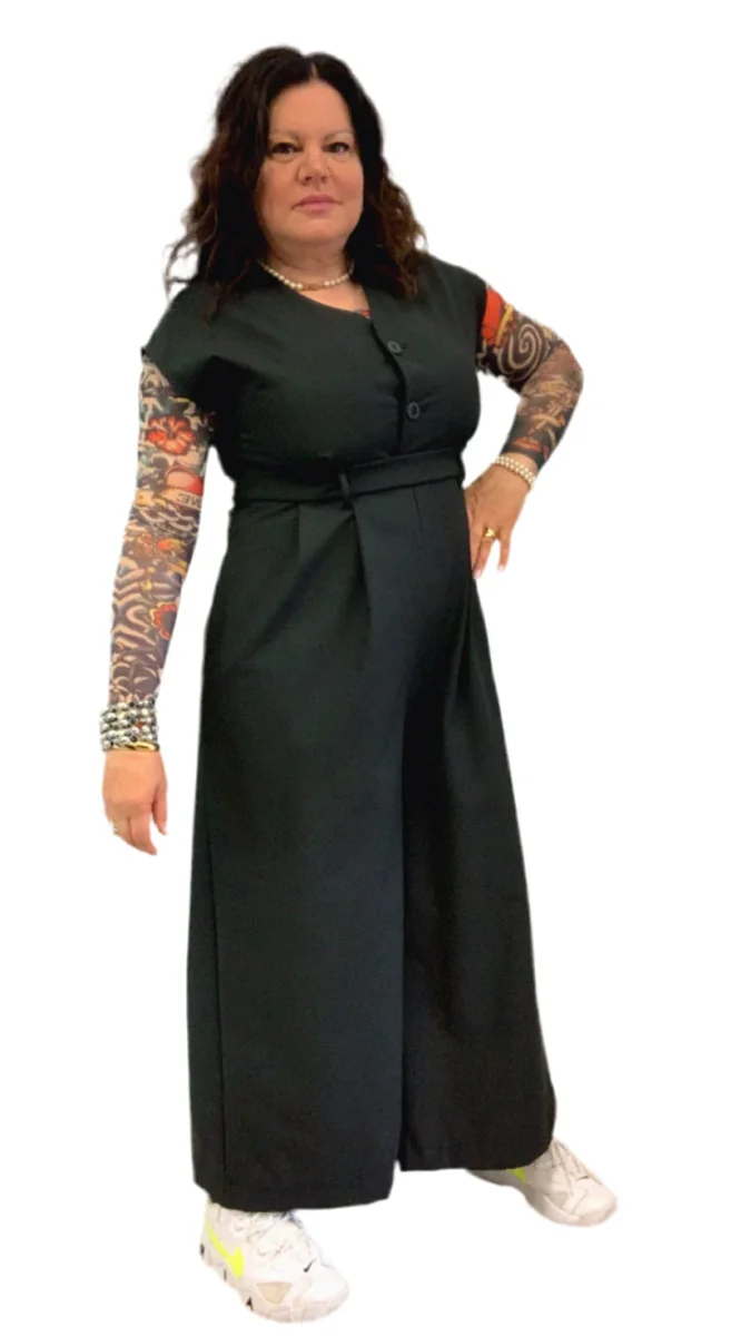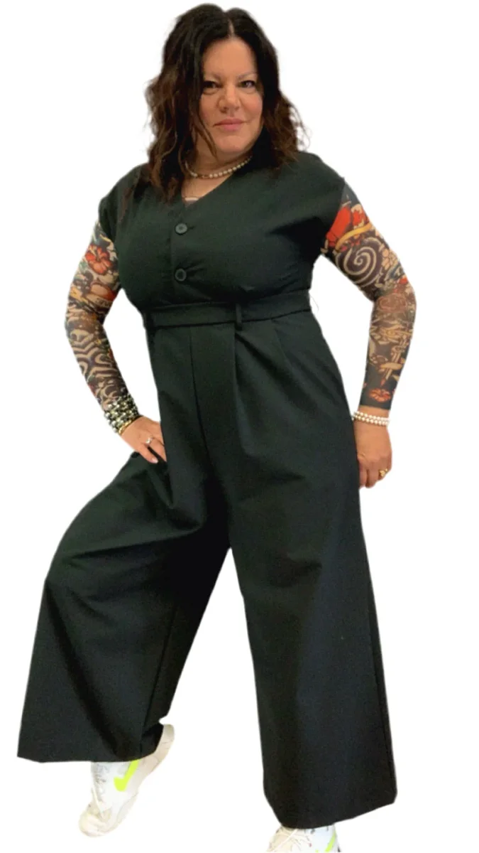 Tuta manica corta ,2 bottoni davanti ,zip dietro per chiusura ,pince davanti ,vita alta ,pantalone morbido ,tasche laterali . Taglia unica s/L 63% poliestere33% viscosa 4% elastan