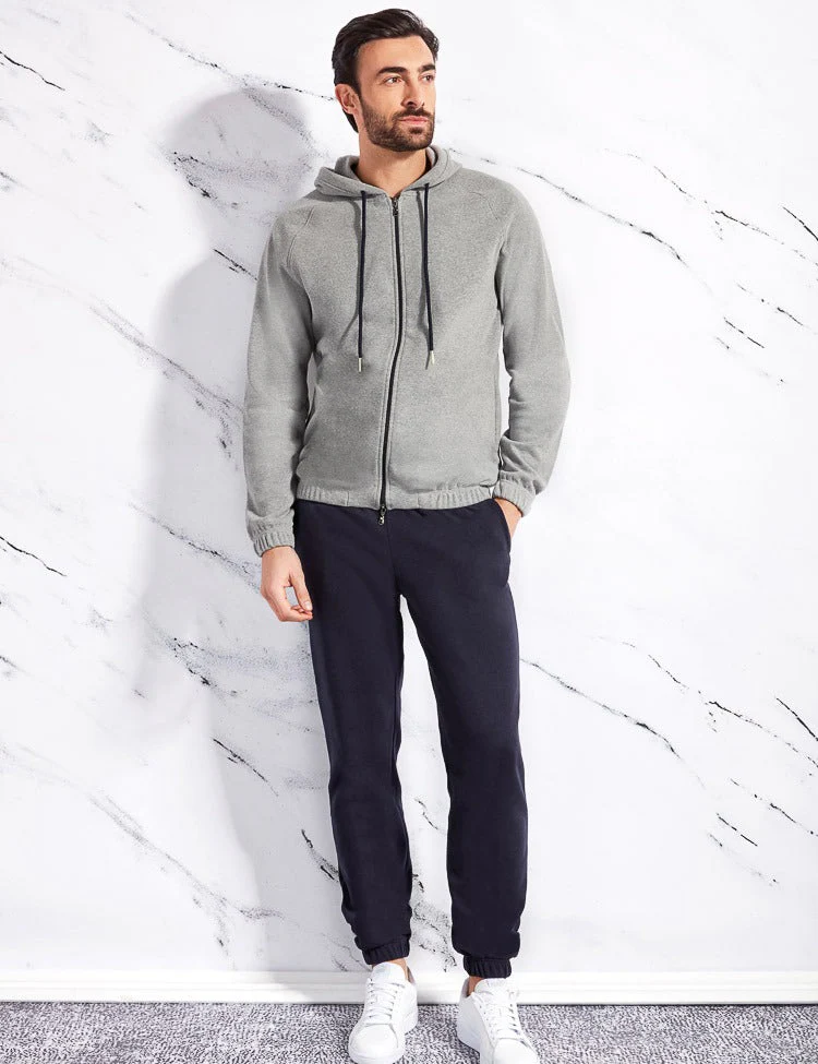 Giacca aperta manica lunga con zip e cappuccio, fascia e polsini sul fondo della manica. Panatlone lungo con polsini sul fondo. Vestibilta’ regular Composizione : 55%poliestere-45%cotone