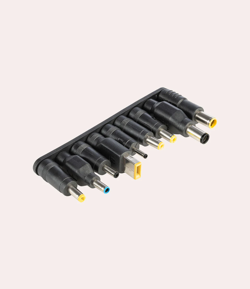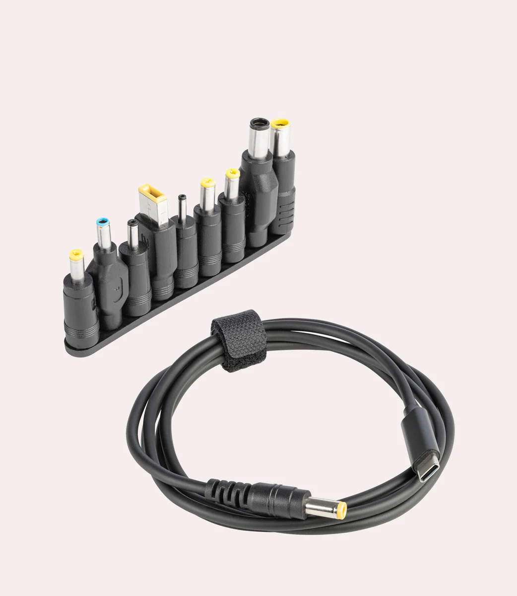 Cavo di alimentazione universale per laptop da 65W con uscita USB-C e DC. Compatibile con caricabatterie con tecnologia GaN. Puoi collegarlo comodamente al tuo caricatore con ingresso USB-C ed il set di 9 connettori incluso permette di utilizzarlo con la maggior parte dei laptop in commercio.