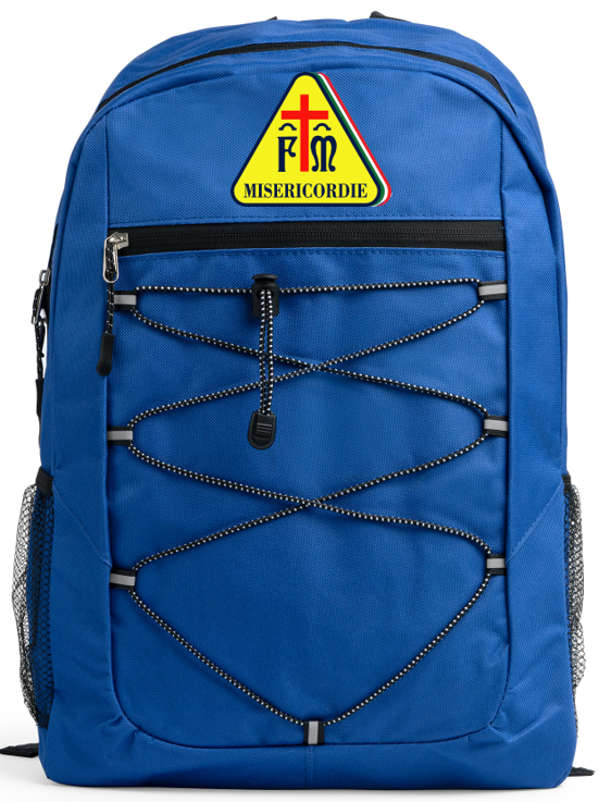Zaino sportivo in poliestere 600D. Chiusura a zip nella tasca principale e in quella anteriore. Cordino elastico anteriore e tasche laterali in rete. Schienale e spallacci imbottiti.